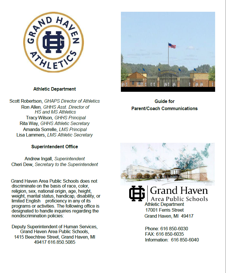It is our expectation that our staff, coaches, and parents also represent themselves and the school in a very positive way when they attend any athletic event, home or away. As with any successful team, we must all work together to ensure that Grand Haven athletics continue a tradition of excellence.