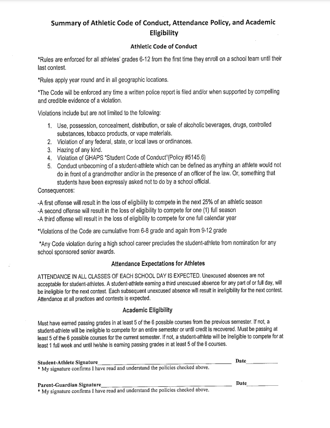 Your student has indicated a desire to participate in the high school interscholastic athletic program. Parents of student athletes also commit themselves to certain responsibilities and obligations, which are outlined in this athletic handbook. Your signature on the Athletic Code, along with the signature of your student athlete, indicates that you understand and accept those responsibilities and obligations, and agree to cooperate with school personnel in enforcing the athletic code. Parents will be required to attend informational meetings scheduled by the athletic director at the beginning of each season. Athletes will not be allowed to play until his or her parents have met with the athletic director. Individual meetings will be scheduled with the athletic director for parents who are unable to attend the informational meeting.
