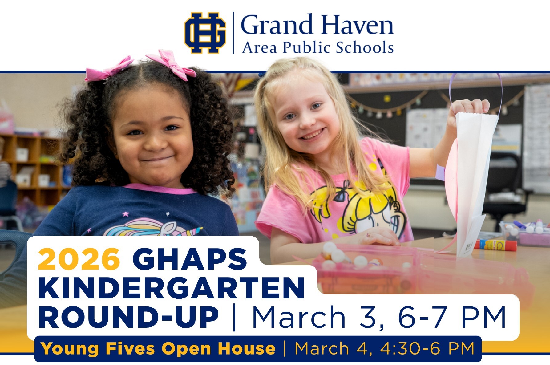 Join us March 3, from 6 – 7 p.m. at each GHAPS elementary school for Kindergarten Round-Up, and on March 4, from 4:30 – 6 p.m. at Duneside Discovery Center for a Young Fives Open House. Learn more and complete our annual Intent to Enroll form.
