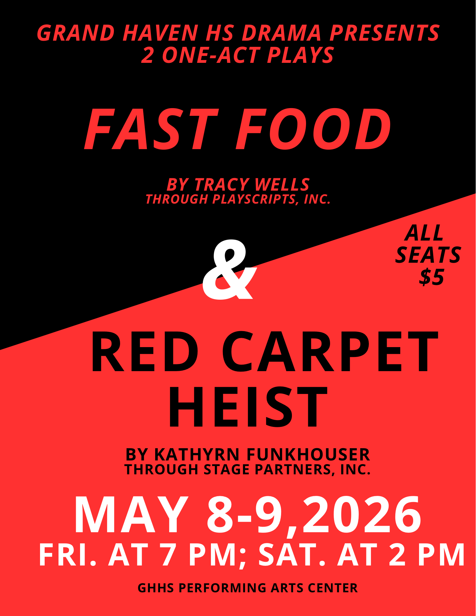 Both productions are short comedies, each featuring a cast of about 15 students. The first play, Fast Food, centers on humorous situations inside a fast food restaurant. The second, Red Carpet Heist, follows a movie star’s team as they plot a diamond heist during a glamorous movie premiere.
