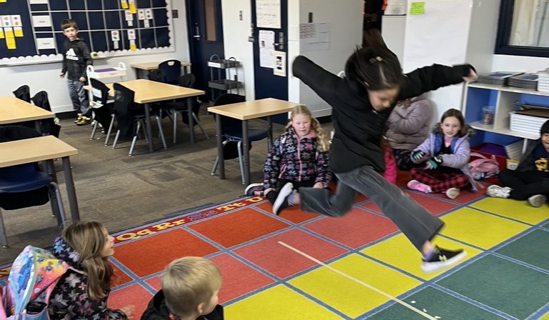 In Racheal Rickabaugh’s 2nd-grade classroom at Ferry Elementary, a math lesson on number lines turned into a full-body learning experience. Students practiced making “jumps” on a number line, then translated those jumps into real long jumps across the room, all while trying to reach a target number in as few jumps as possible. The activity helped students see how combining forward and backward jumps can efficiently reach a target number—bringing movement, strategy, and math together in a memorable way