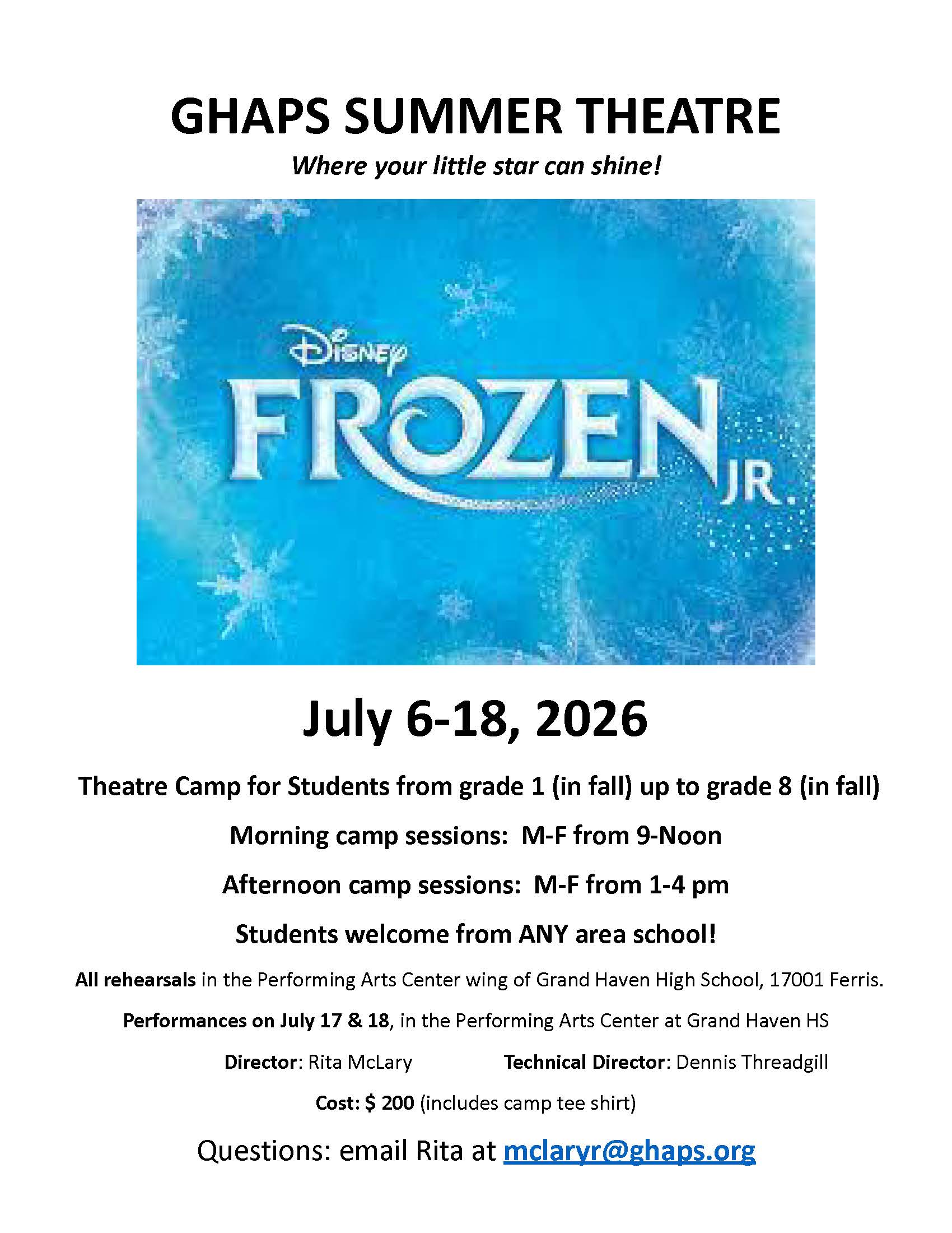 Grand Haven Area Public Schools is pleased to provide a summer theater opportunity for children. Our goal is to strengthen and enhance the singing, acting and dancing skills of each child, and improve confidence, in a safe and supportive environment. Instruction is daily, Monday through Friday, for two weeks. On the final Friday/Saturday we will present our show to family and friends. Children must have completed kindergarten to enroll. Performers are usually in elementary and intermediate school. The student mentors are typically high school and college students.